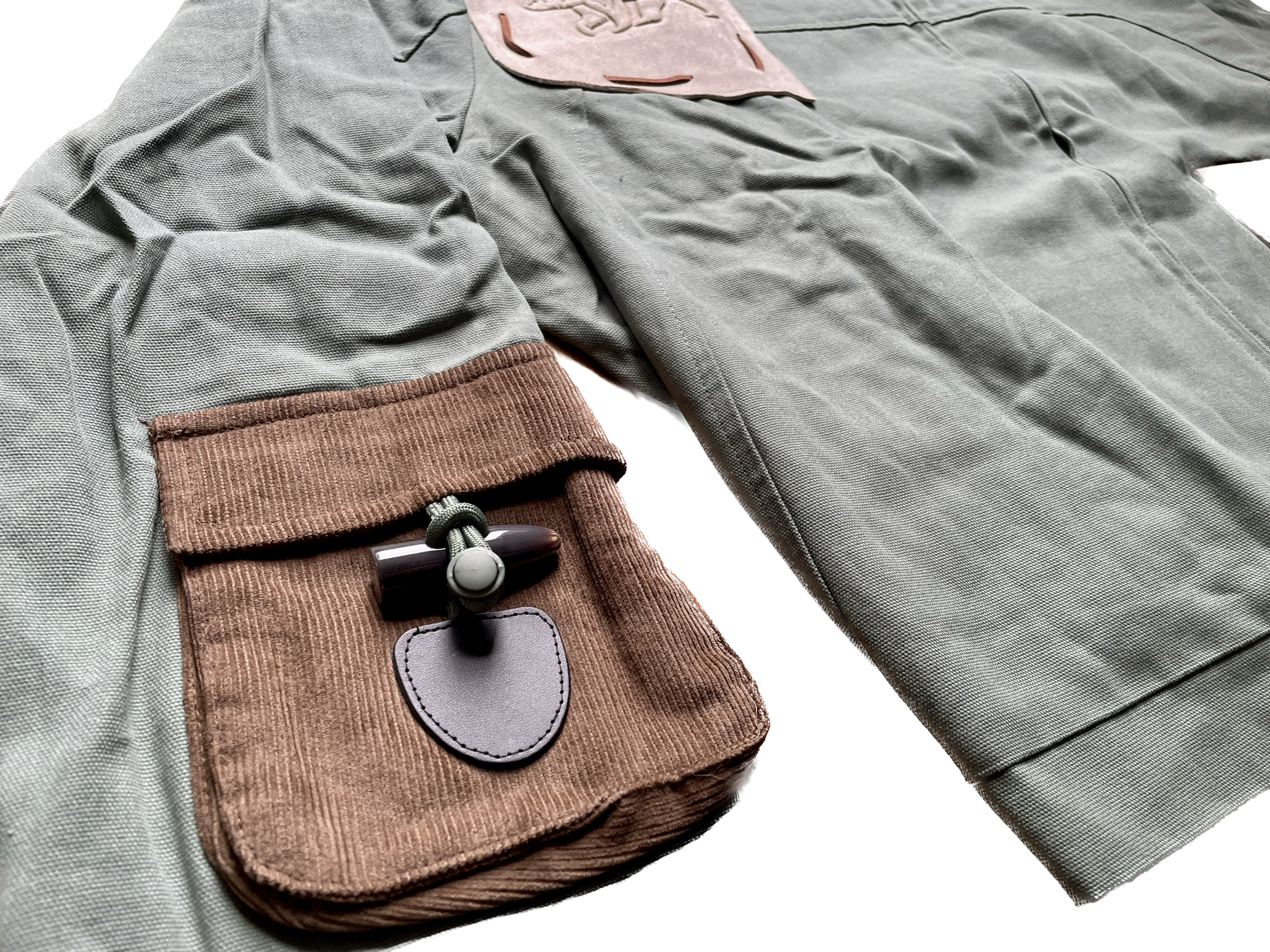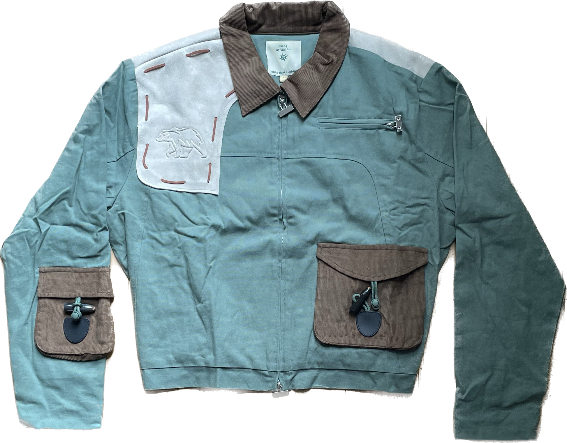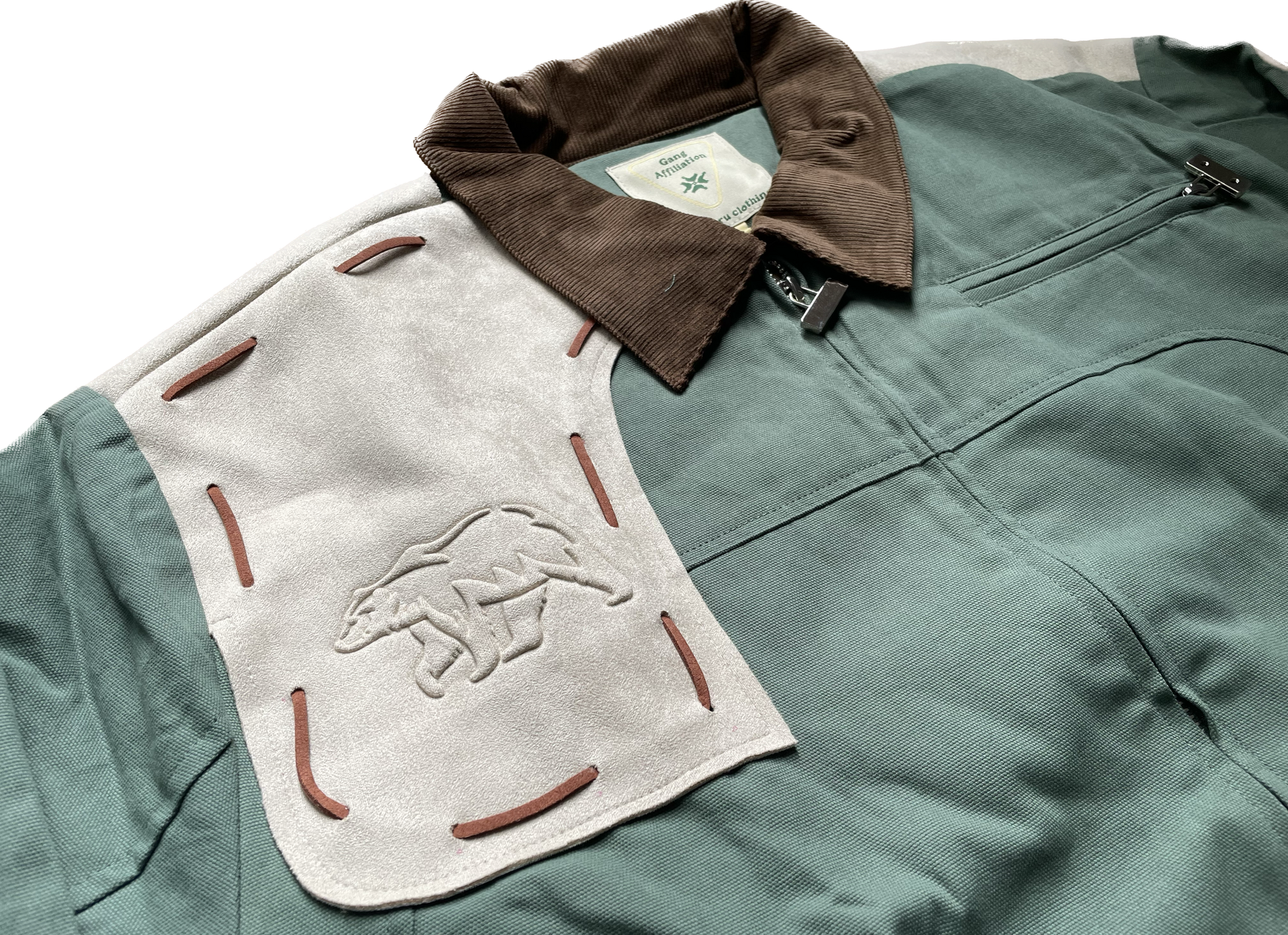 GANG AFFILIATION FUR TRAPPING COLLECTION SHOOTERS JACKET. FULL CANVAS AND CORDUROY CONSTRUCTION, EMBROIDERY ON BACK ICON. FIXED HEM WAIST. DRY CLEAN ONLY. FEATURES OUR SIGNATURE SUEDE RECOIL RELIEF SHOULDER PATCH EMBOSSED WITH BEAR ICONOGRAPHY. **SLIM FIT, SUGGEST YOU SIZE UP.****